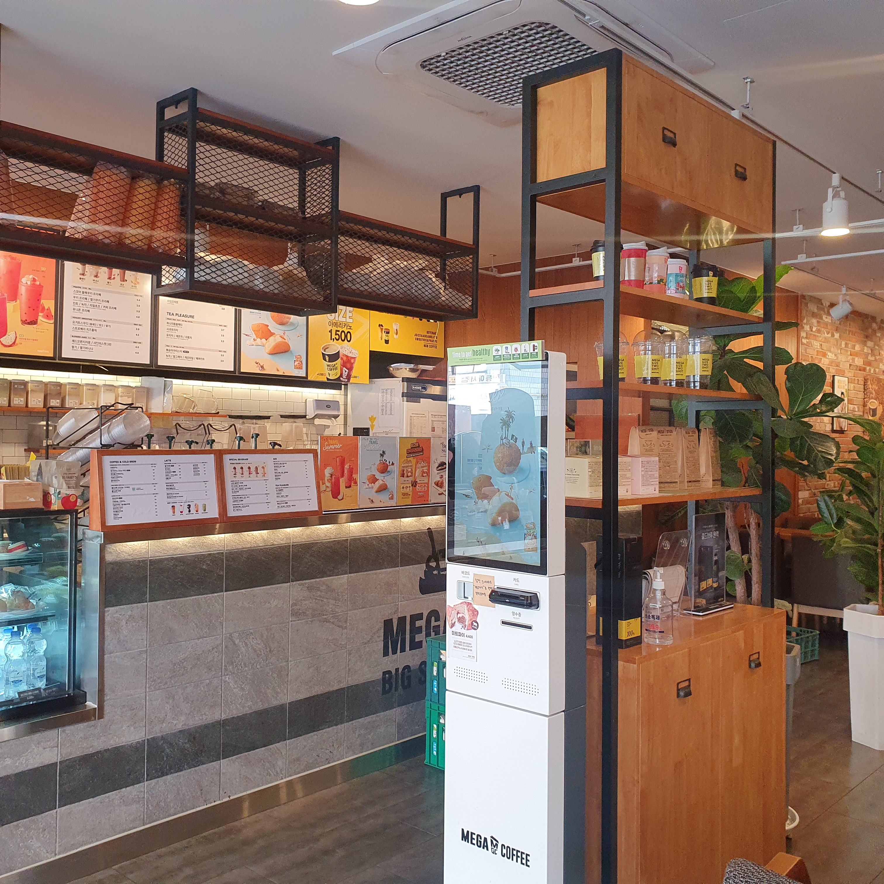 메가커피 익산모현점은 오전 8시 오픈으로 이른 시간에 출근하는 사람들이 방문하기 좋다. 모든 주문을 100% 키오스크를 통해 받는데 입구 왼편에 작은 키오스크가 있고 매장 내에 큰 키오스크가 있다.